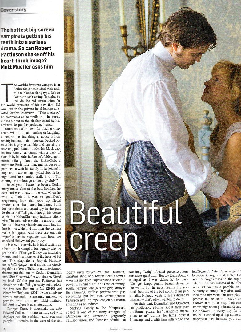 “El Vampiro favorito del mundo está en Berlín para una visita relámpago y, fiel a su tipo de chupasangres, Robert Pattinson no está comiendo. Esta noche, él va a estar en la alfombra roja para el estreno mundial de su nueva película, Bel Ami, pero en el salón privado del hotel asignado para esta entrevista – “Este es elegante”, comenta mientras pasea en – que apenas hace mella en la ensalada de pollo que ha ordenado, a pesar de su hambre profeso.